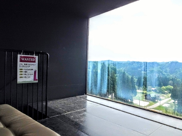 窓から見えるのは松之山の里山。周辺の森は「キョロロの森」と名付けられており、自然観察などの体験プログラムも開催されています。