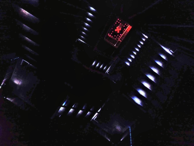 四角い螺旋階段は、これ自体が《大地、水、宇宙》by 逢坂卓郎というアート作品。暗闇に伸びる階段は、赤と青のダイオードが道しるべです。