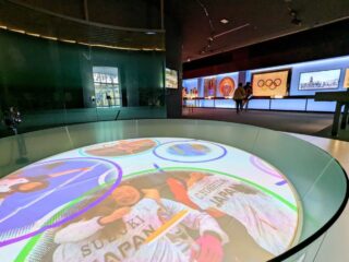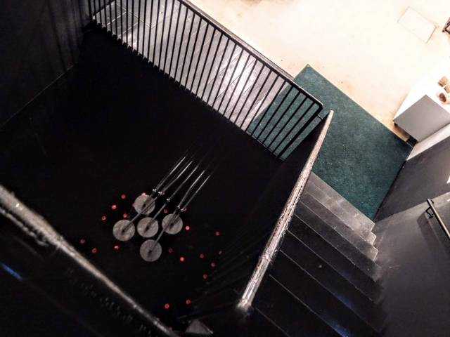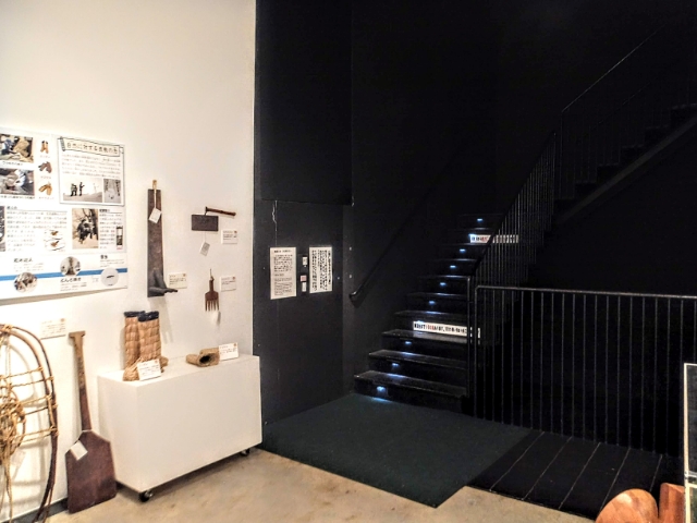 館内を奥に進むと、真っ暗な階段が。こちらは展望台へと続く階段です。明るかった博物館から一転して暗闇の世界が広がります。