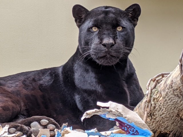 ダンボールで遊ぶジャガーの「みわ」。体は大きくたくましいですが、遊び方はネコそのもの。散らかったダンボールを見ると、これから飼い主に怒られる絵が浮かびます。