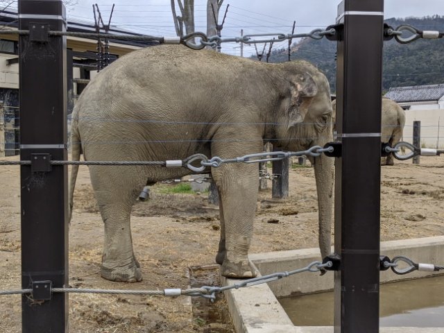 マレーシアやラオスからやってきたアジアゾウたち。5頭飼育されており、まるで立体曼荼羅のようにずっしりと並んだ象は壮観。天気が良い日は、水浴びする姿も見ることができるらしい。