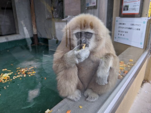 こちらはシロテナガザル。顔周りの毛が白いので、白眉・白ヒゲの仙人みたいな風貌です。名前は「シロマティー」。
