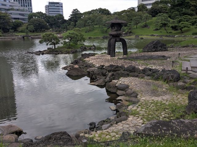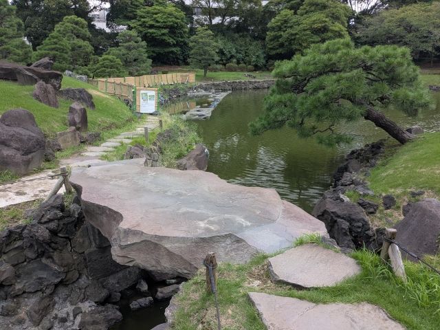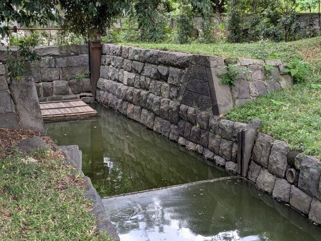 もともとこの池は海水を取り入れた潮入りの池であったそう。潮の干満によって水位が変わり景観も変化するという、なんとも趣深い庭園でした。海面の埋め立てなどが行われたことにより、その機能は失われますが、今も海水取入口跡は残されています。