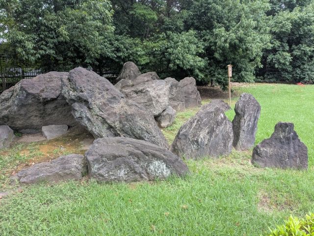 4つ並ぶ石柱。こちらは小田原北条家に仕えた戦国武将・松田憲秀の旧邸から運ばれた門柱であるそう。ここが小田原藩の上屋敷であった際、茶室に使われていたとのことです。