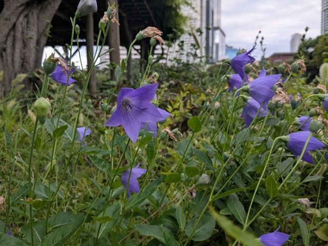 深い青紫の花はキキョウ。秋の七草にも数えられる植物ですが、花期は6月〜9月と夏〜初秋となっています。美しい星形の花は、土岐氏や明智氏といった武家の家紋に採用されるのも頷けます。