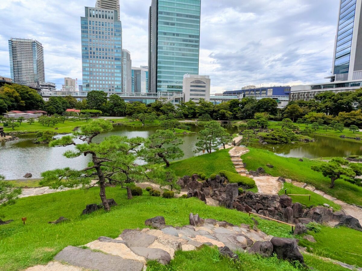 まず目に入るのは園内の中央に位置する大きな池、大泉水。周辺には高いビルが立ち並んでいますが、ここだけぽっかり空いています。都会のオアシスという表現がぴったりハマる庭園です。