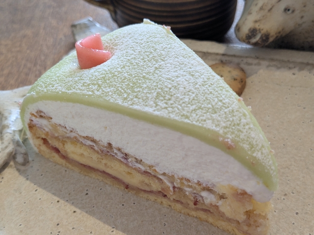 その正体は、スポンジの間にカスタードクリーム&ラズベリーが入ったケーキ。表面がグリーンのマジパンで覆われており、見た目にも楽しいメニューです。バラをイメージしたピンクのマジパンも添えられています。