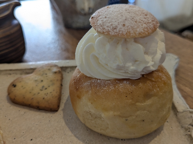 北欧の伝統的な菓子パン「セムラ」も販売しています。通常のセムラよりひと回り小さな「ミニセムラ」(380円)があったので、ケーキセットにプラスして注文しちゃいました。