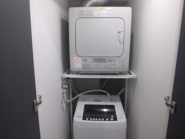 掃除機や洗濯機もあります。ベランダが無いため干す場所に困るかと思いきや、乾燥機があるので問題なし。
