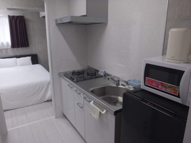 部屋内にはキッチンもあります。ガスコンロに加えてレンジ、ポット、冷蔵庫完備。