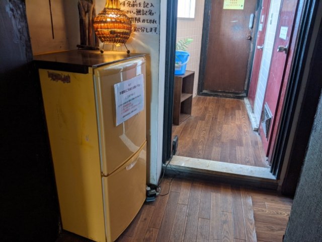 オレンジの沖縄そばの看板が非常に目立ってますが、そのすぐ隣に入り口があります。雑居ビルのような雰囲気の中、壁に貼られた看板が目印です。