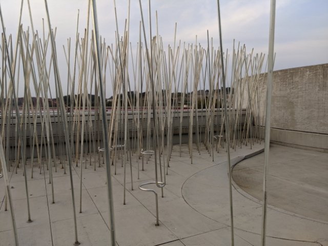 屋上にも登ることができます。そこに広がるのは鉄パイプの森のような作品「MUSEUM-STAIRS / ROOF OF NEEDLES & PINS」by アコンチ・スタジオ。触れることができる作品なのですが、固いパイプをイメージして触ると予想外の感触に驚きます・・・!