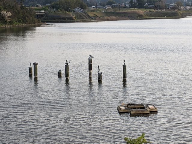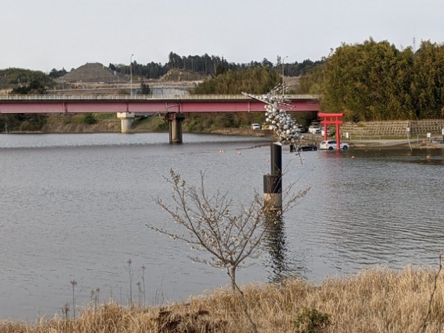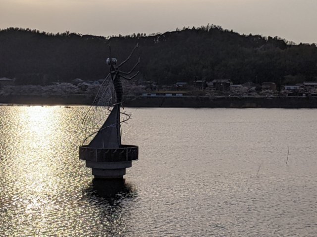 湖の中にも作品は建てられています。逆光でわかりにくいのですが、巨大なトンボのような姿をしたオブジェ。顔はトンボのようなのですが、羽根の様子がカゲロウのようにも見えます。