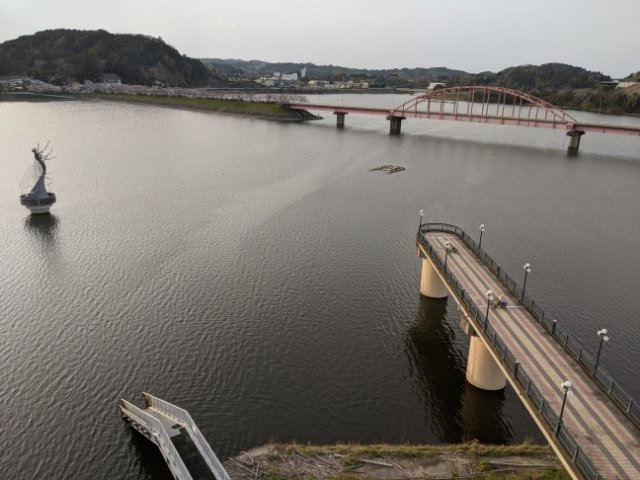 てっぺんからは高滝湖を一望できます。水上アート作品や、たくさん並んだボート、突き出した部分で一休みする人々の姿など色々と目に入って面白い。