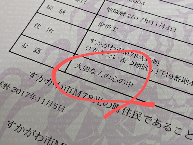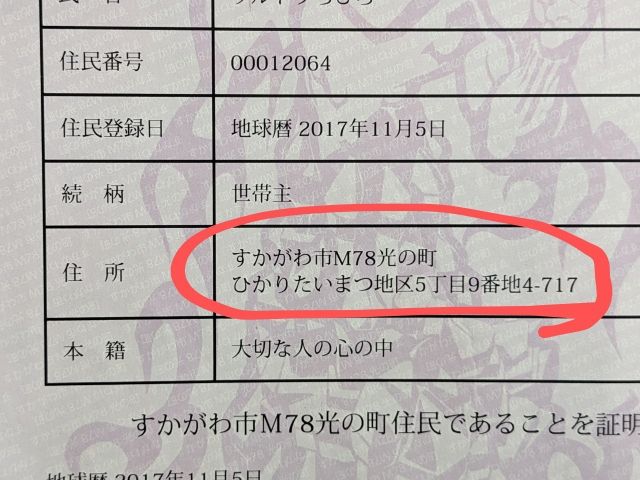 いきなり何を言い出すのかとお思いでしょうが。須賀川市では「すかがわ市M78光の町」の住民票を発行することができるのです!