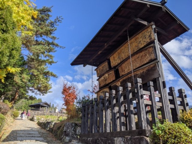 馬籠宿の町並みを登った先には高札場があります。奉行の名のもと、様々なルールが書かれた木札が貼られており、新しい法令などをここで周知していました。文字が読めない人も多かったため、庄屋(村の首長)は村人を集めて内容を読み聞かせていたそう。