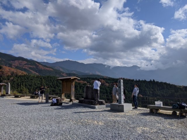 目の前には恵那山をはじめとした山々が広がり、なんとも爽快。登ってきた疲れも一瞬で吹き飛びます。もし疲れが吹き飛ばなくても、屋根付きの休憩所やベンチもあるため、景色を眺めながら休憩もできます。