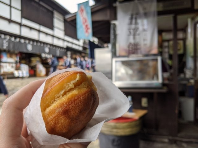 秋の馬籠宿といえば栗!あちこちで栗きんとんや栗ソフトなどの栗グルメを販売しています。そんな中でも食べ歩きにぴったりなのはこちらの「栗ふく」。中程にあるつちまやというお店で食べることができるお菓子です。