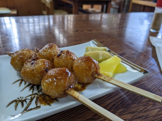 こちらの五平餅は小さいお団子が串に3つ刺さったお団子スタイル。1本100円というお手軽さ。焼き立てのお餅は香ばしくてとって美味しい!