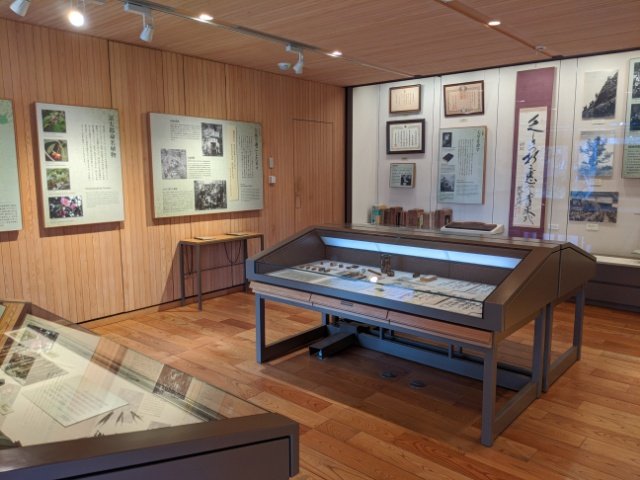 園内にある記念館は、牧野富太郎に関する資料を集めた小さなミュージアム。年表や写真付のパネル、採集道具、直筆の原稿や色紙などが展示されています。