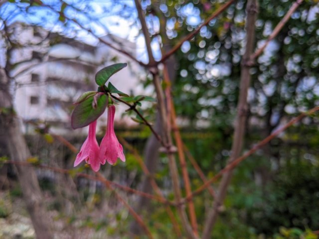 赤紫のカラーリングがかわいらいしい、小さなラッパ型の花をつけています。スイカズラ科の植物ですが、名前はカズラではなくカグラなのがポイント。漢字にすると「鶯神楽」と、とっても麗しい字面です。