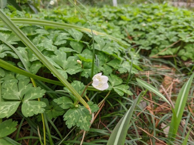 白くて可憐な花を咲かせています。1輪の花が咲くイチリンソウの仲間で、2輪の花を付けるためニリンソウという名が付いています。しかし、写真のようにニリンソウでも1輪しか花を付けていいなかったり、また3輪咲くケースもあるそう。さらにサンリンソウという種類も存在しており、こちらは1~4輪の花を咲かせることがあるそう。混乱してきました。