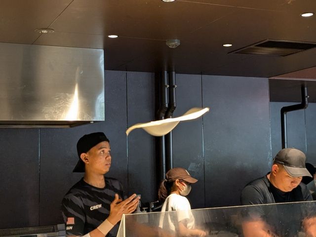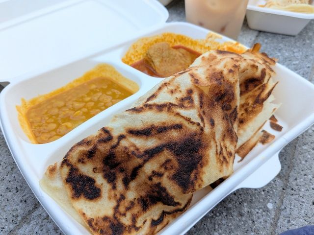 購入のために並んでいると、ロティーチャナイ作りも見ることができます。お兄さんが薄くのばした生地を振り回したり、浮かせたり、ほぼ指一本でまわすようなワザも。サービス精神旺盛なパフォーマンスに、待機列でも退屈しません。