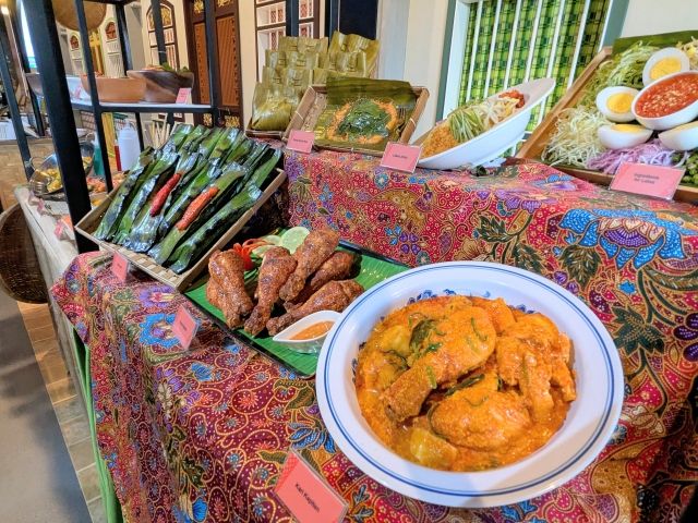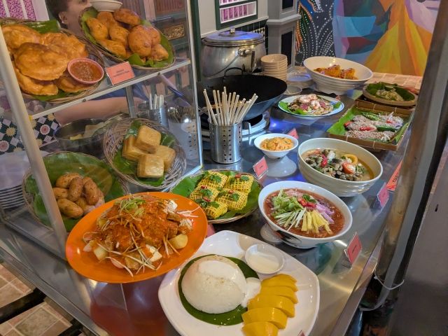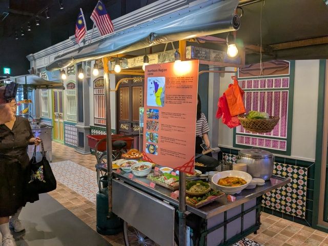 屋台に並んでいるのはカラフルな食品サンプル。案内板に記されている「ネグリ・センビラン」や「マラッカ」というコトバ、こちらは料理の名前ではなく都市の名前。各地域の料理の特徴を解説しています。