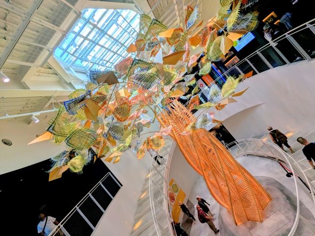 屋台の部屋を抜けると、竹とラタンでできたインスタレーション。マレーシア人アーティストのレッド・ホン・イによる作品であり、「調和の樹」と題されています。葉の部分は、先住民族の職人による手織りで仕上げられているそう。