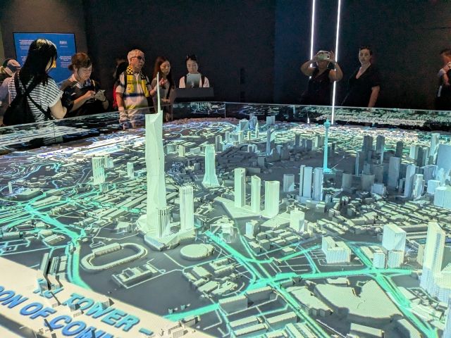 ジオラマを使ったマッピングは、「成長する首都」というテーマ。壁面には2040年に向けたスマートシティ計画が表示されています。