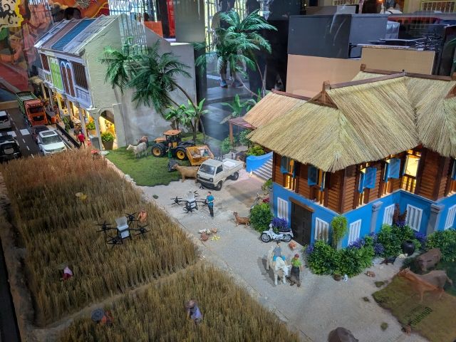 その隣には「自然とカンポン」のジオラマ。カンポンというのは、村・集落などを指す言葉。農業や酪農風景の中をドローンが飛ぶ様子も描かれています。