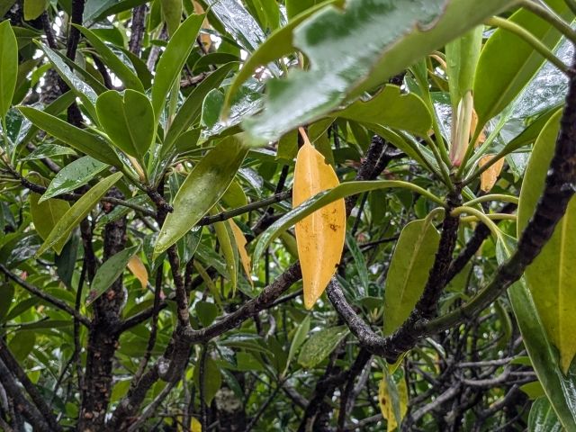 オヒルギを見ると、稀に黄色い葉があります。これは紅葉ではなく、塩が集まっている葉っぱ。オヒルギは海水の浄化能力が低いため、取り込んだ塩分を一枚の葉っぱに集め、それを落とすことで体外に排出しているそうです。しょっぱいというウワサですが、ここは国立公園なので葉っぱをちぎるのはNGとのこと。