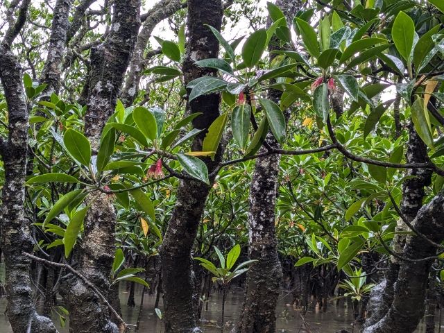 赤い花をつけているのはオヒルギというマングローブ。まるでタコさんウインナーみたいなかわいらしい花が付いています。