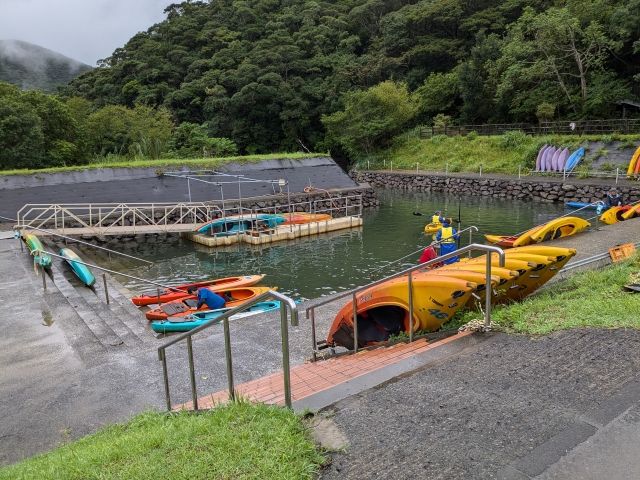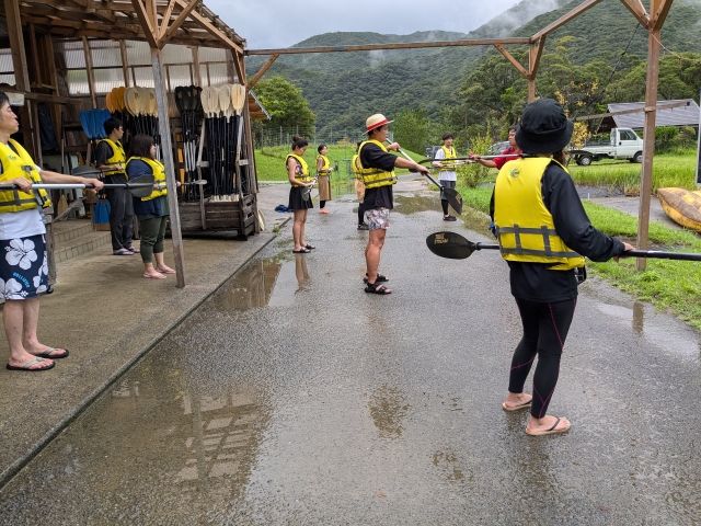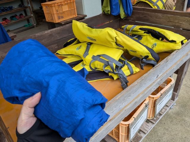 まずはライフジャケットを来てスタンバイ。雨に備えてレインコートの貸し出しもあります。