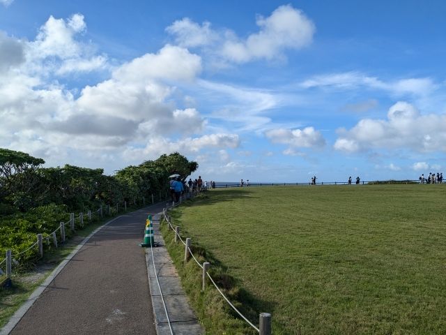 その先は芝生に伸びる遊歩道。海風が心地よく、開放的な空気です。