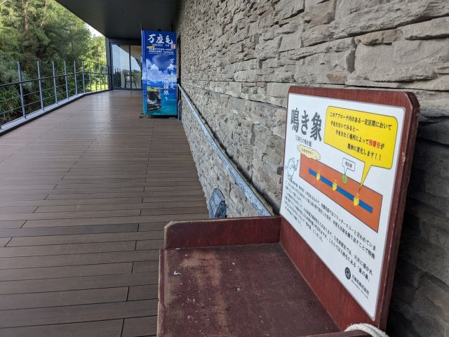 施設の外の通路には「鳴き象」が体験できるポイントがあります。ここで手を叩くと、音が多重反射するフラッターエコーが発生して独特な響きに。日光東照宮の「鳴き龍」と同じ効果ですが、ここでは万座毛のゾウに似た奇岩にちなんで「鳴き象」と名付けられています。