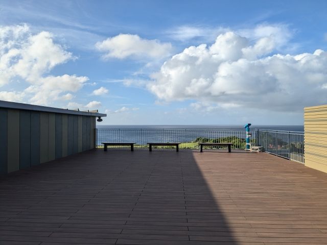 この施設の3階のテラスからは、万座毛そのものは見えないけど遊歩道が一望できます。ちょっとだけインフィニティ感もあります。