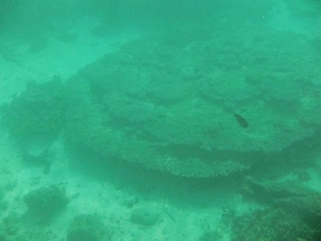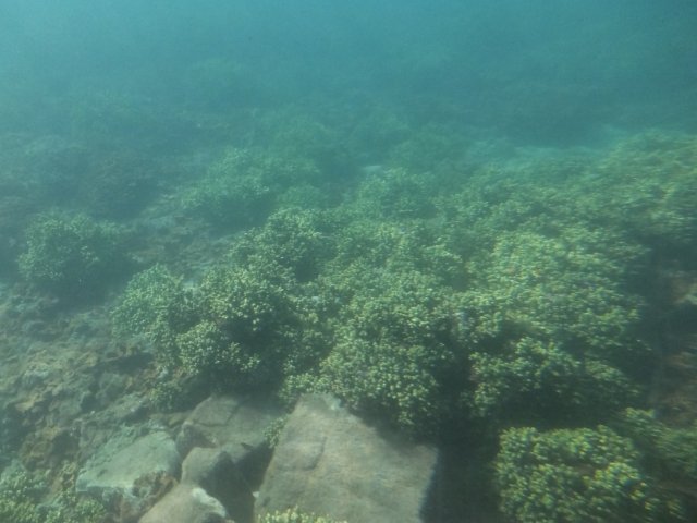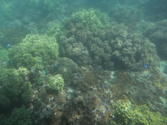 あまり上手く写真に撮れなかったのですが、青色がきれいなソラスズメダイや黄色いチョウチョウウオなどのカラフルな魚が泳いでます。ソラスズメダイは飼育下では鮮やかな青色ではなくなってしまうので、自然で見るのが一番キレイです。