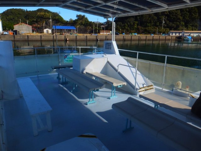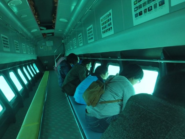 船室は両サイドがガラス張りになっており、海の中を覗くことができます。この季節、海に潜ることはできないので海中を見ることができる貴重なチャンス。