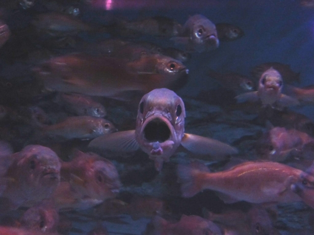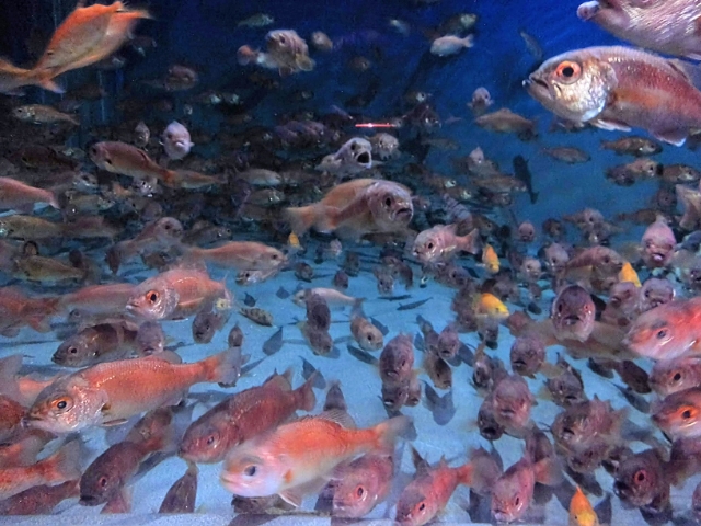 マリンピア日本海では世界初アカムツの受精に成功。その影響か、水槽内にはこれでもかというくらい大量にいます。全部売ったらいくらに・・・なんてことを考えてはいけません。