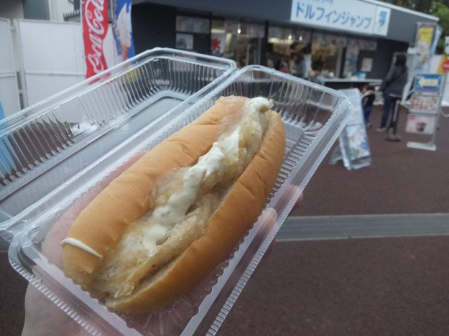館内のレストラン「UMINONE~海の音~」では「ノドグロの天ぷら」を食べることができます。私は手軽にノドグロドッグにしました!脂ののった白身は、フライと相性抜群でした。