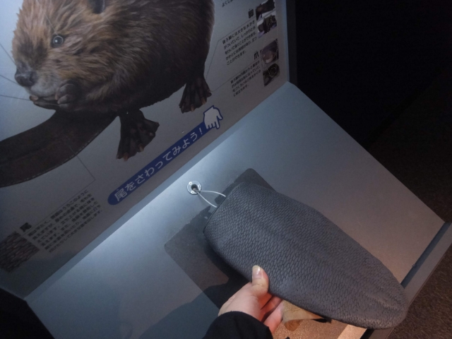 すぐ側には、さわれるビーバーのしっぽが置いてありました。重量感のある質感で、まるでゴムボートのオールみたい。ばたばたと動かせば、とても早く泳げそう。