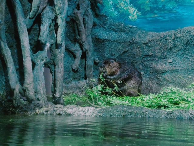 こちらはアメリカンビーバー。座ると見事な三段腹。短い手でぼりぼりお腹をかきながら、むしゃむしゃ食事しています。絵に描いたような太っちょキャラです。