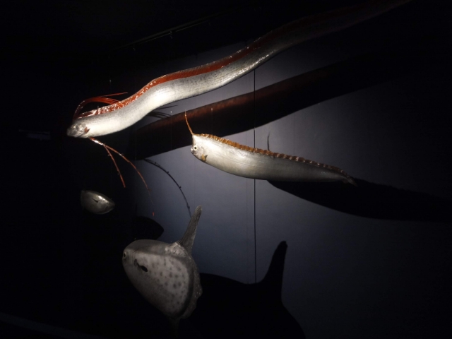 マニアックな魅力が光る深海魚も、バラエティ豊富にとりそろえています。こちらはリュウグウノツカイやアカナマダの剥製。