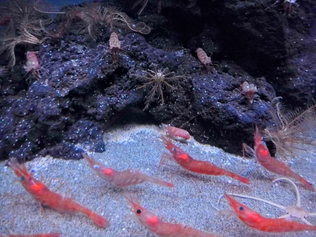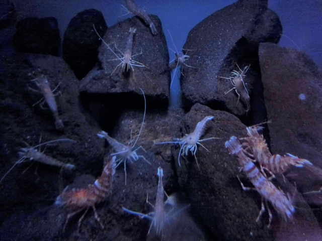 暗闇に浮かぶのはイバラモエビやトヤマエビなど様々な種類のエビたちの布陣。まるでこれから夜襲でもしそうな勢いです。