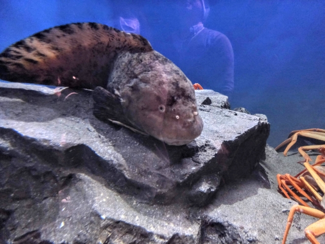 岩の上にいるのは、大きいのに柔らかそうな不思議な魚。その正体はイサゴビクニン。サケビクニンはよく見かけますが、こんな大きいビクニンもいるのですね!なんだかオオサンショウウオみたいでとってもかわいいです。
