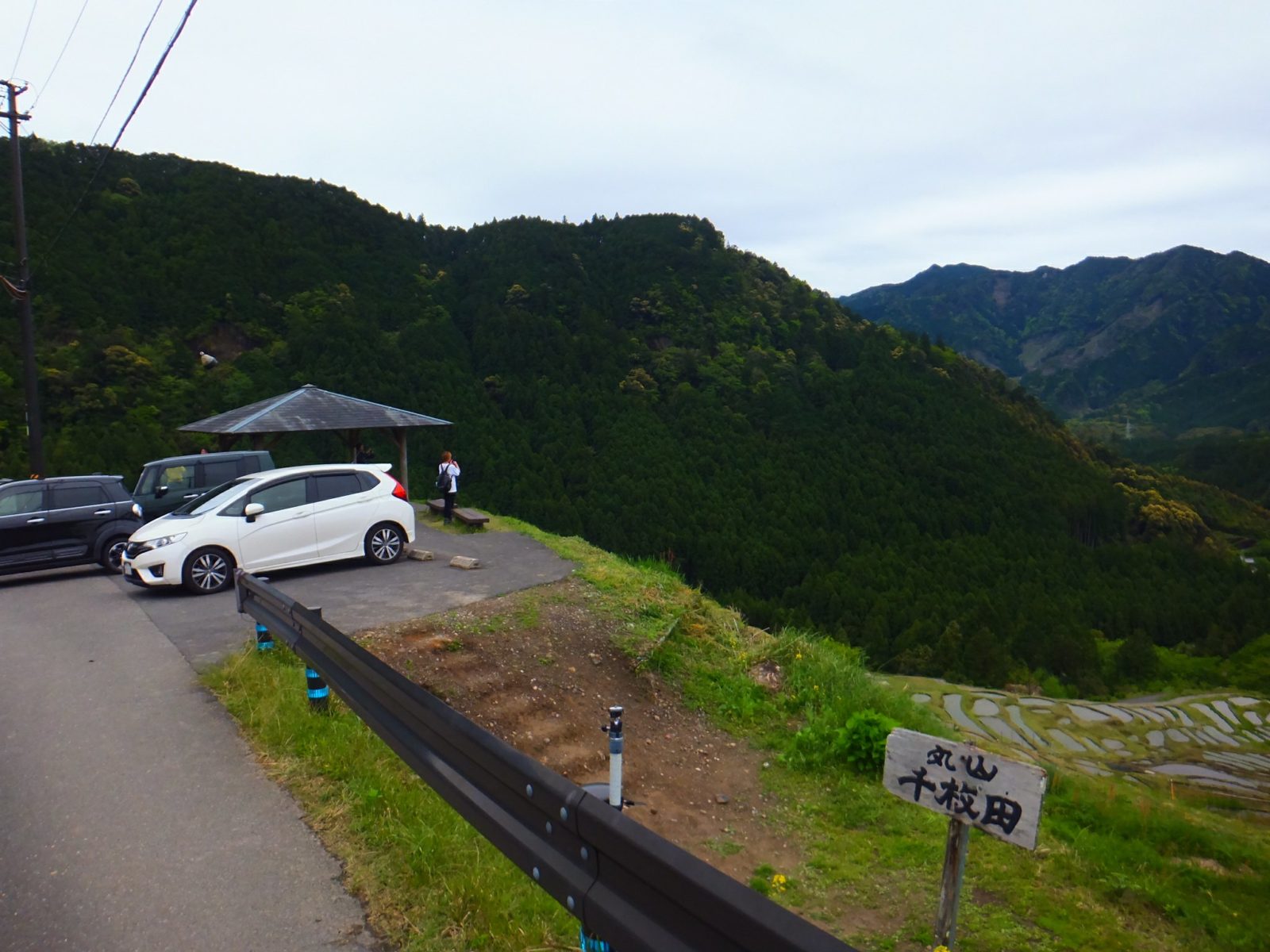 下から見てもあまり棚田の雰囲気は感じ取れないので、田んぼの中の道をくねくねと登ります。一番上まで来ると、5台ほど停められる駐車スペースと東屋があります。