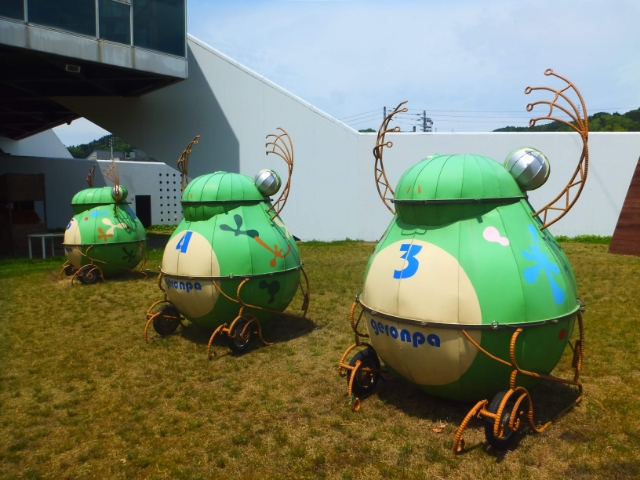 農舞台のすぐ傍にあるのは《ゲロンパ大合唱》by 大西治・大西雅子。まるでジェームス・ブラウンのようなファンキーなタイトルのカエルさんたち。セックス・マシーンならぬ、農業で使用される堆肥製造マシーンがもとになっている作品です。なお、英語名は「A great chorus of “Get Up!”」。完全にJBでした。