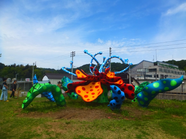 旅行雑誌でもおなじみな《花咲ける妻有》by 草間彌生。ドットが特徴的な不思議な植物。自然界でこの配色を見ると、ついつい有毒生物かと疑ってしまいますね。