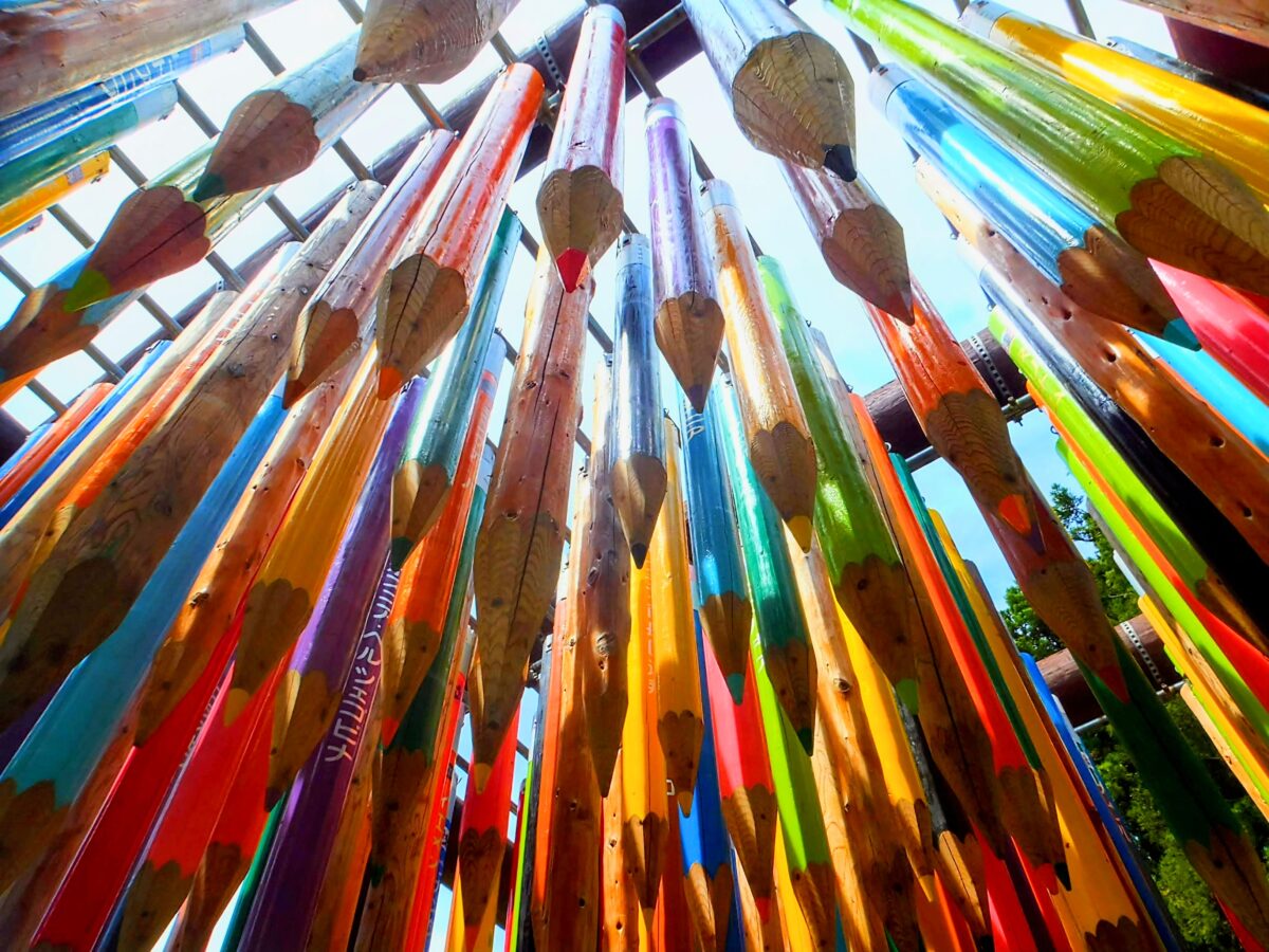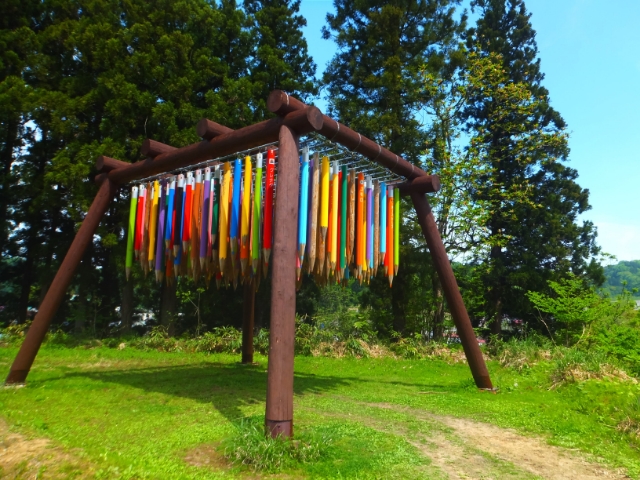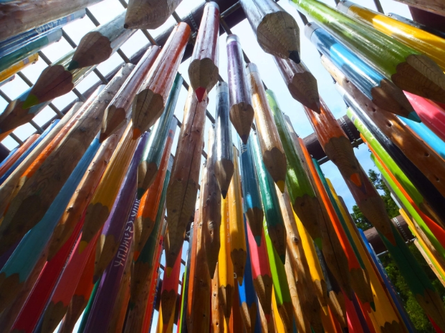 農舞台から少し山の方へ進むと見ることができる《リバースシティ》by パスカル・マルティン・タイユー。ぶら下がったたくさんの色鉛筆。よく見ると、それぞれに世界の国名が書かれています。